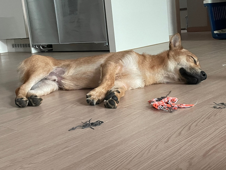 He is an active boy but he can also be calm if his leader needs to focus on work. Whenever his foster parents work, he either sleeps beside his human or plays with toys by himself.